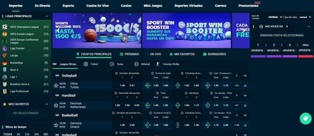 La plataforma ofrece cuotas competitivas en varios deportes, ligas y eventos, incluidos deportes populares y poco conocidos, así también como apuestas de eSports para juegos como Dota 2, CSGO, LoL, Valorant, StarCraft 2, Rocket League, Rainbow Six, King of Glory y Call of Duty, con más de 30 mercados de apuestas para los principales partidos y torneos.